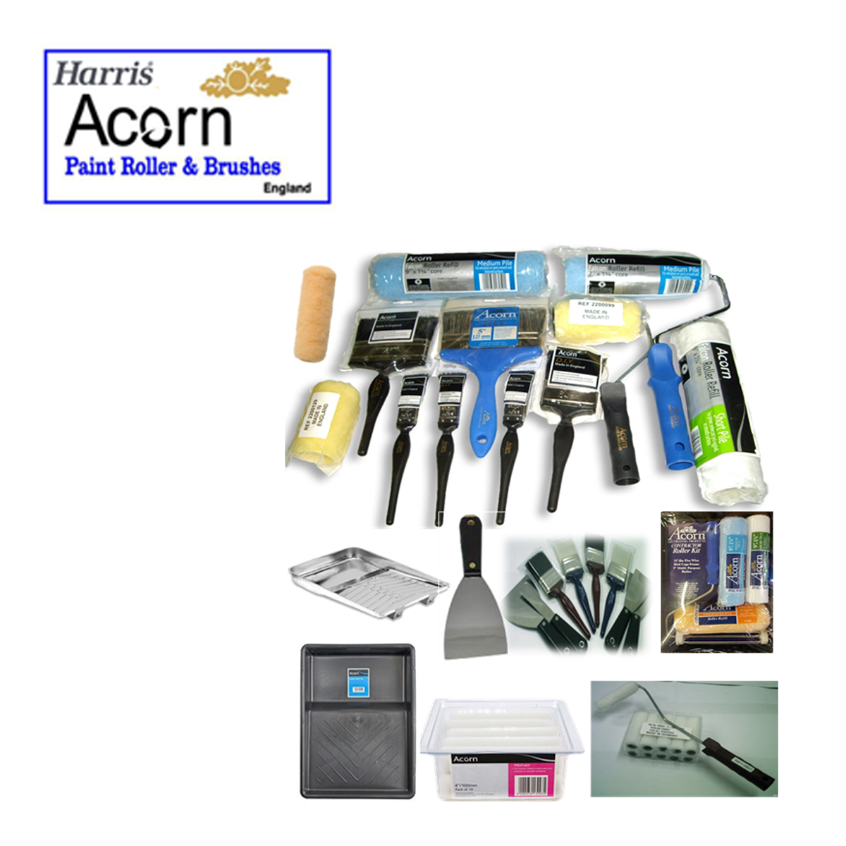 More than Century old famous Brand Acorn now under roof of Harris int. Tool with bristles/fibers painting, surface finishing and for many other purposes. It is one of the most basic and versatile tools known to mankind. It generally consists of a handle or block to which filaments are affixed either parallel- or perpendicular-wise, depending on the way the brush is to be gripped during use. We offer super famous brand from modern world. We are huge stockiest and we have wide rang of Acorn UK Painting Products such as a Fine animal and non animal bristle Brushes, Fiber covered Painting rollers, Paint Trays, Scrapers for all reason.